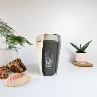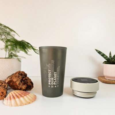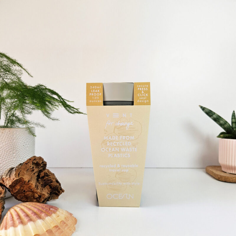 Refillable and reusable travel cup made in the UK from recycled ocean-bound plastic in a Ecru Beige. Illustrated with the words “Protecting Our Precious Planet Together” and the VENT logo.