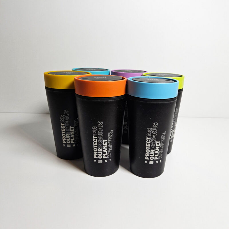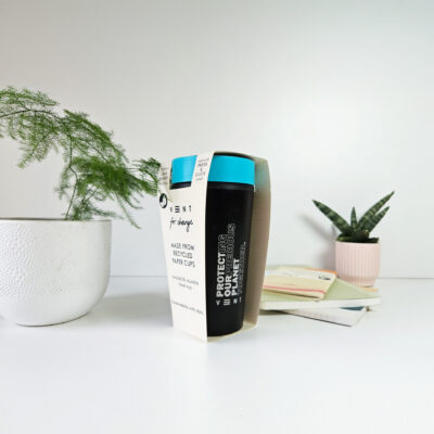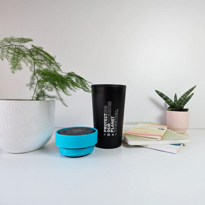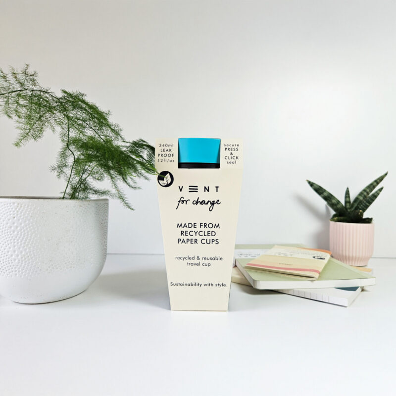 Refillable and reusable travel cup made in the UK from recycled paper in a Electric Blue design. Illustrated with the words “Protecting Our Precious Planet Together” and the VENT logo.