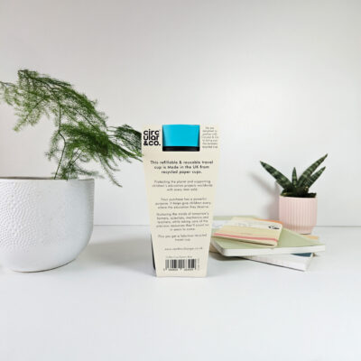 Refillable and reusable travel cup made in the UK from recycled paper in a Electric Blue design.