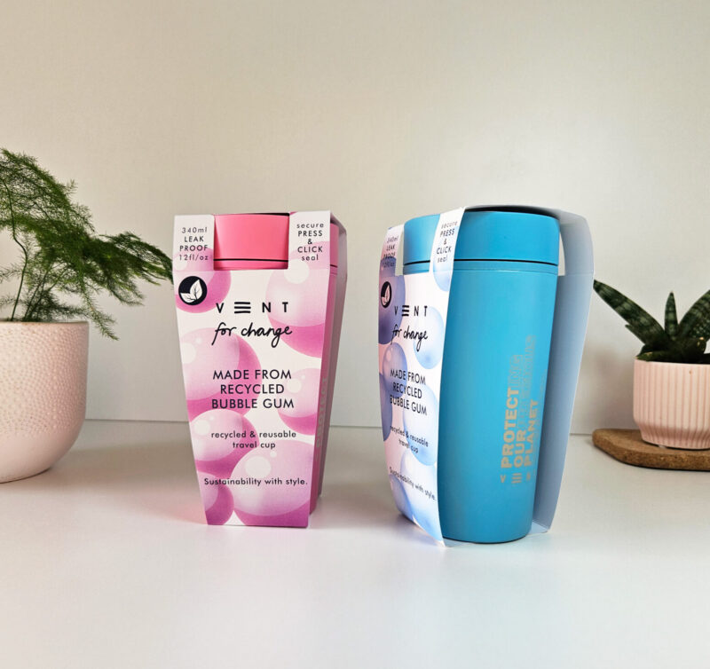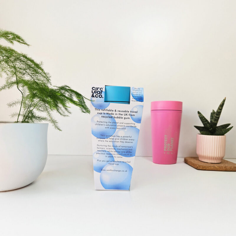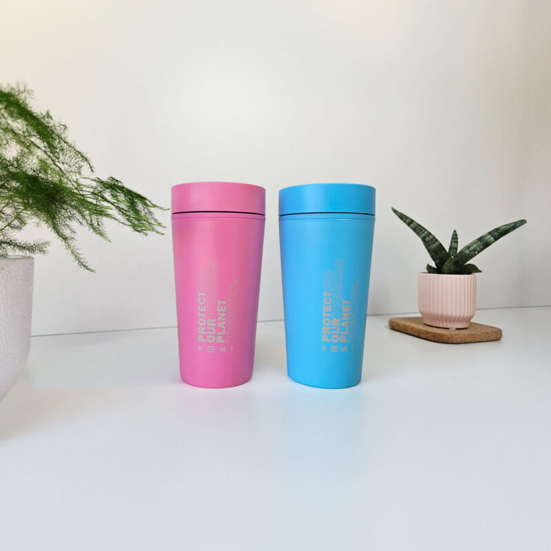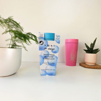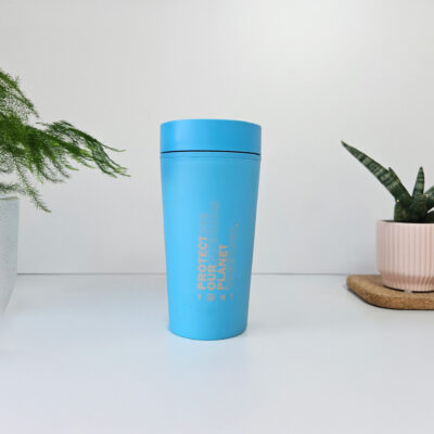 Refillable and reusable travel cup made in the UK made from bubblegum in a Sky Blue design. Illustrated with the words “Protecting Our Precious Planet Together” and the VENT logo.